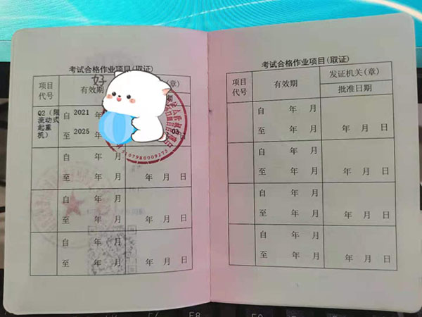 ????起重證也叫行車(chē)證、天車(chē)證(代號(hào):Q2),證書(shū)全國(guó)通用,國(guó)網(wǎng)查詢(xún)。4年一復(fù)審。由市場(chǎng)監(jiān)督管理局頒發(fā),類(lèi)似于汽車(chē)駕駛執(zhí)照,上崗必備。