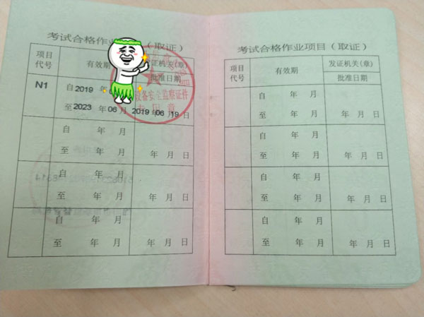 叉車證N1,電梯維修T,特種安全設備管理A,起重機指揮A,Q2起重司機(限門座式起重機),Q2起重司機(限橋式起重機),Q2起重司機(限門式起重機),Q2起重司機(限纜索式起重機),Q2起重司機(限塔式起重機),Q2起重司機(限流動式起重機),Q2起重司機(限升降機),觀光和觀光列出司機,鍋爐壓力容器壓力管道管理A,電梯管理A,起重機械管理A,場(廠)內專用機動車輛管理A,工業鍋爐司爐G1,電站鍋爐司爐G2,鍋爐水處理G3,快開門式壓力容器操作R1,移動式壓力容器充裝,氣瓶充裝,金屬焊接操作-壓力焊PE焊,非金屬焊接操作-壓力容器焊,食品檢驗員,化學檢驗員,農產品檢驗員(4年一審,需要到期前3個月進行)從事特殊工種作業人員,必須熟悉相應特殊工種作業的安全知識及防范各種意外事故的技能。要求從業人員持證上崗,即由國家安全生產監督管理局頒發《中華人民共和國特種作業操作證》方可上崗。