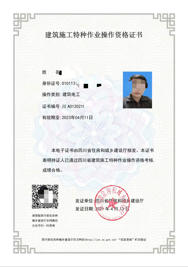 四川省住房和城鄉建設廳:特種作業操作證: 建筑電工,建筑架子工,建筑架子工(附著升降腳手架,)建筑起重司索信號工,建筑起重司機(塔式起重機),建筑起重安裝拆卸工(塔式起重機)建筑起重機械司機(施工升降機),建筑起重安裝拆卸工(施工升降機),建筑起重機械司機(物料提升機),建筑起重安裝拆卸工(物料提升機),高空作業吊籃安裝拆卸工,經省級以上人民政府建設主管部門認定的其他特種作業。 國務院建設主管部門負責全國建筑施工特種作業人員的監督管理工作。 申請從事建筑施工特種作業的人員,應當具備下列基本條件: 1,年滿18周歲且符合相關工種規定的年齡要求,2, 初中及以上學歷,3, 符合相應特種作業需要的其他條件。 建筑施工特種作業人員是指在房屋建筑和市政工程施工活動中,從事可能對本人、他人及周圍設備設施的安全造成重大危害作業的人員。 建筑施工特種作業人員必須經建設主管部門考核合格,取得建筑施工特種作業人員操作資格證書(以下簡稱“資格證書”),方可上崗從事相應作業