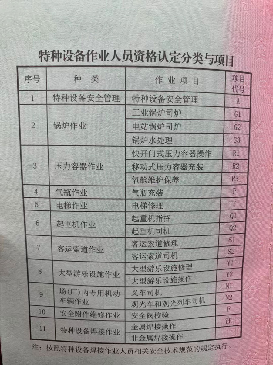 叉車司機-叉車證N1,電梯維修T,特種安全設備管理A,起重機指揮Q1,Q2起重司機(限門座式起重機),Q2起重司機(限橋式起重機),Q2起重司機(限門式起重機),Q2起重司機(限纜索式起重機),Q2起重司機(限塔式起重機)Q2起重司機(限流動式起重機)Q2起重司機(限升降機),觀光和觀光列出司N2,壓力容器壓力管道管理A,電梯管理A,起重機械管理A,場(廠)內專用機動車輛管理A,工業鍋爐司爐G1,電站鍋爐司爐G2,鍋爐水處理G3,快開門式壓力容器操作R1,移動式壓力容器充裝R2,氣瓶充裝P,金屬焊接操作-壓力焊PE焊,非金屬焊接操作-壓力容器焊,食品檢驗員,化學檢驗員,農產品檢驗員(4年一審,需要到期前3個月進行)從事特殊工種作業人員必須熟悉相應特殊工種作業的安全知識及防范各種意外事故的技能。要求從業人員持卡上崗,即由國家安全生產監督管理局頒發《中華人民共和國特種作業操作證》方可上崗。