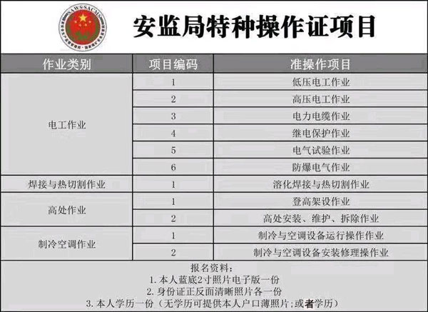 低壓電工操作證,高壓電工操作證,熔化焊接與熱切割作業,焊工操作證,電力電纜,繼電保護,電氣試驗,防爆電器作業,高處安裝維護拆除作業,登高架設作業,制冷與空凋設備運行操作作業,制冷與空凋設備安裝修理作業,施工吊裝作業,施工挖裝作業,危化品負責人/管理人員,危化品從業人員上崗證,新辦,審證,換證;
