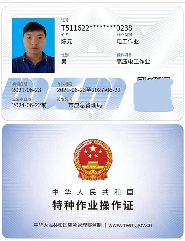 電工證有六個操作項目,分別是:高壓電工、低壓電工、電力電纜、繼電保護(hù)、電氣試驗和防爆電氣。