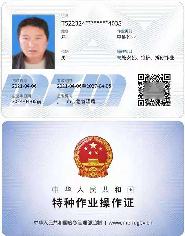 叉車司機-叉車證N1,電梯維修A,特種安全設備管理A,起重機指揮Q1,Q2起重司機(限門座式起重機),Q2起重司機(限橋式起重機),Q2起重司機(限門式起重機),Q2起重司機(限纜索式起重機),Q2起重司機(限塔式起重機)Q2起重司機(限流動式起重機)Q2起重司機(限升降機),觀光和觀光列出司N2,壓力容器壓力管道管理A,電梯管理A,起重機械管理A,場(廠)內專用機動車輛管理A,工業鍋爐司爐G1,電站鍋爐司爐G2,鍋爐水處理G3,快開門式壓力容器操作R1,移動式壓力容器充裝R2,氣瓶充裝P,金屬焊接操作-壓力焊PE焊,非金屬焊接操作-壓力容器焊,食品檢驗員,化學檢驗員,農產品檢驗員(4年一審,需要到期前3個月進行)從事特殊工種作業人員必須熟悉相應特殊工種作業的安全知識及防范各種意外事故的技能。要求從業人員持卡上崗,即由國家安全生產監督管理局頒發《中華人民共和國特種作業操作證》方可上崗。